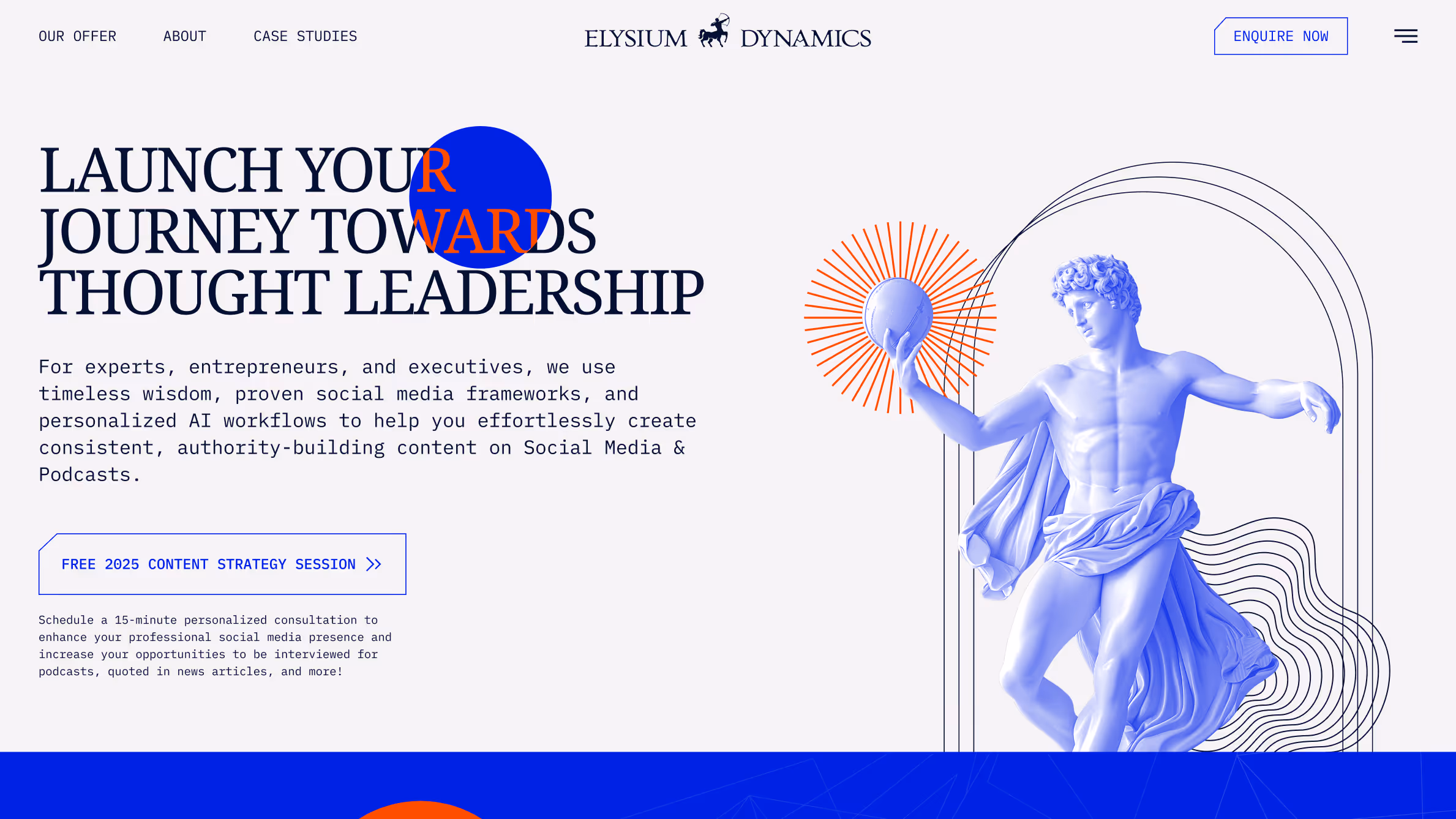 Brand and website design for a thought leadership company. A thematic, story-driven web presence inspired by Greek mythology, merging futuristic aesthetics with classical grandeur.