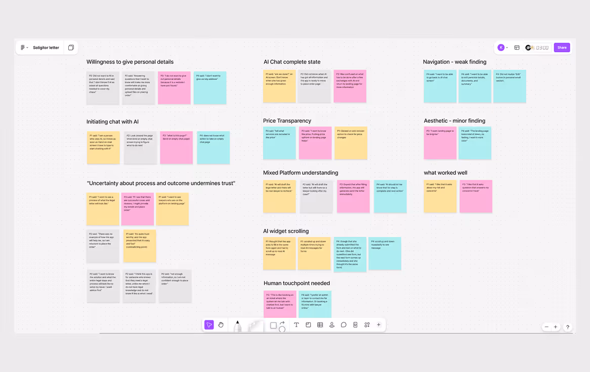 Observations and direct quotes from all sessions were grouped in FigJam. Seven insight themes emerged — spanning interaction friction, trust gaps, platform understanding, and what worked well.